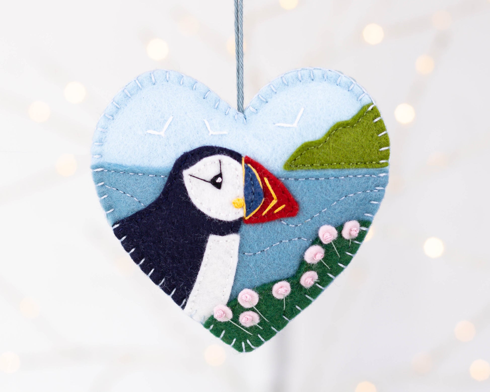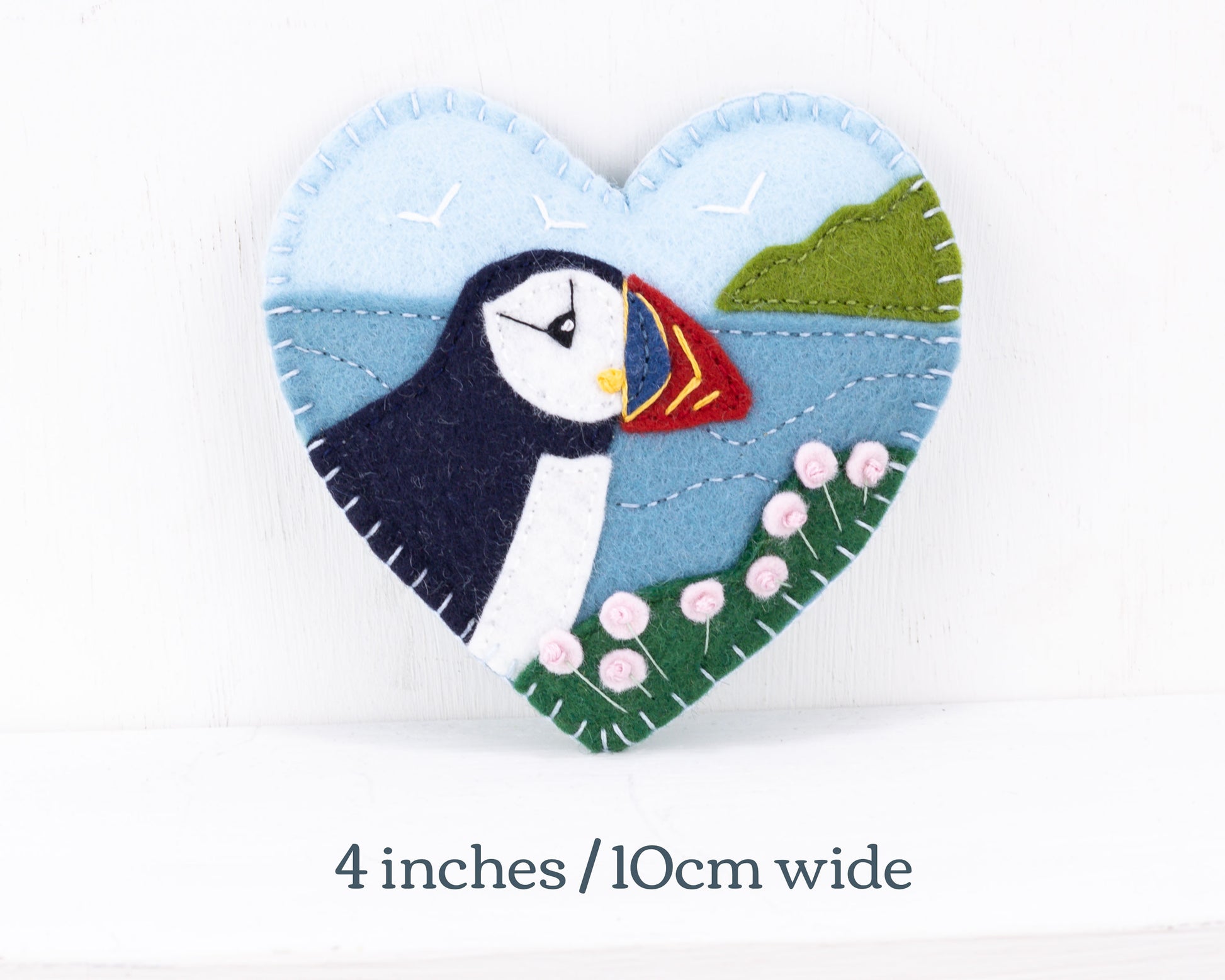 This hand stitched felt heart ornament depicts a puffin nesting among the sea pinks on an Irish cliff top. I make the background by layering small pieces of felt, then adding appliqued and embroidered details. The front is then blanket stitched to the plain felt back, with filling added to make a padded heart.