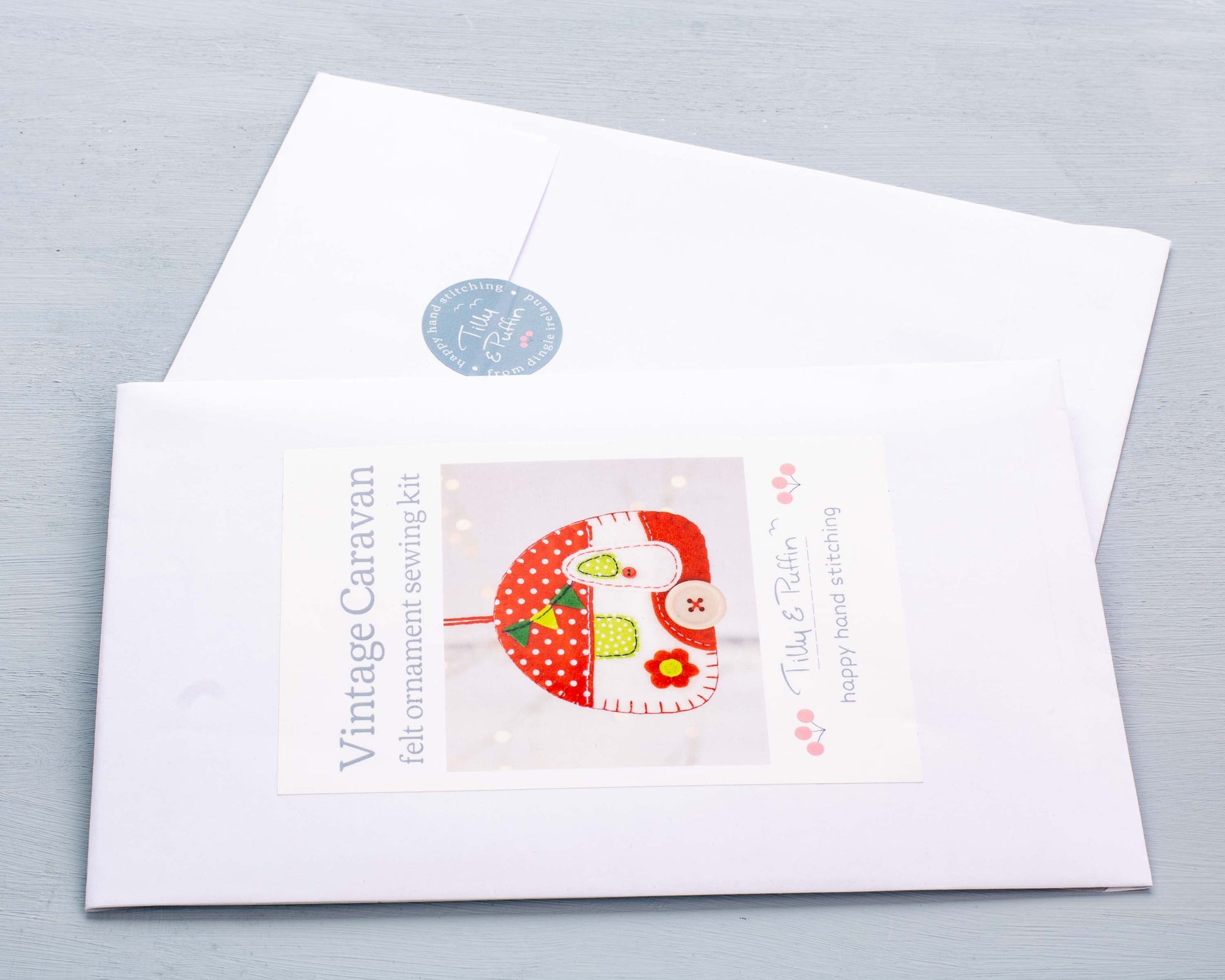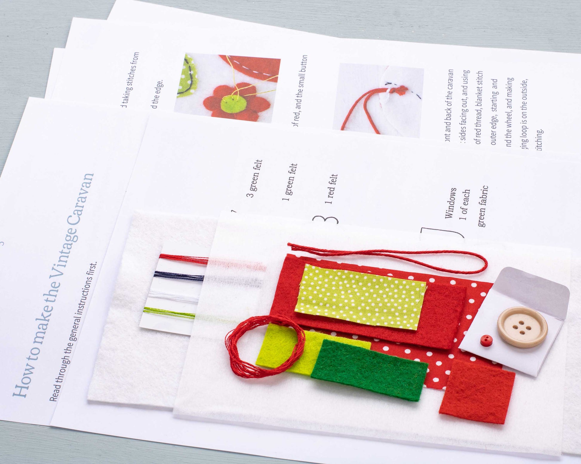 Sew your own vintage caravan felt ornament with this sewing kit, containing felt pieces, embroidery thread and printed templates, together with detailed instructions with step by step photos.