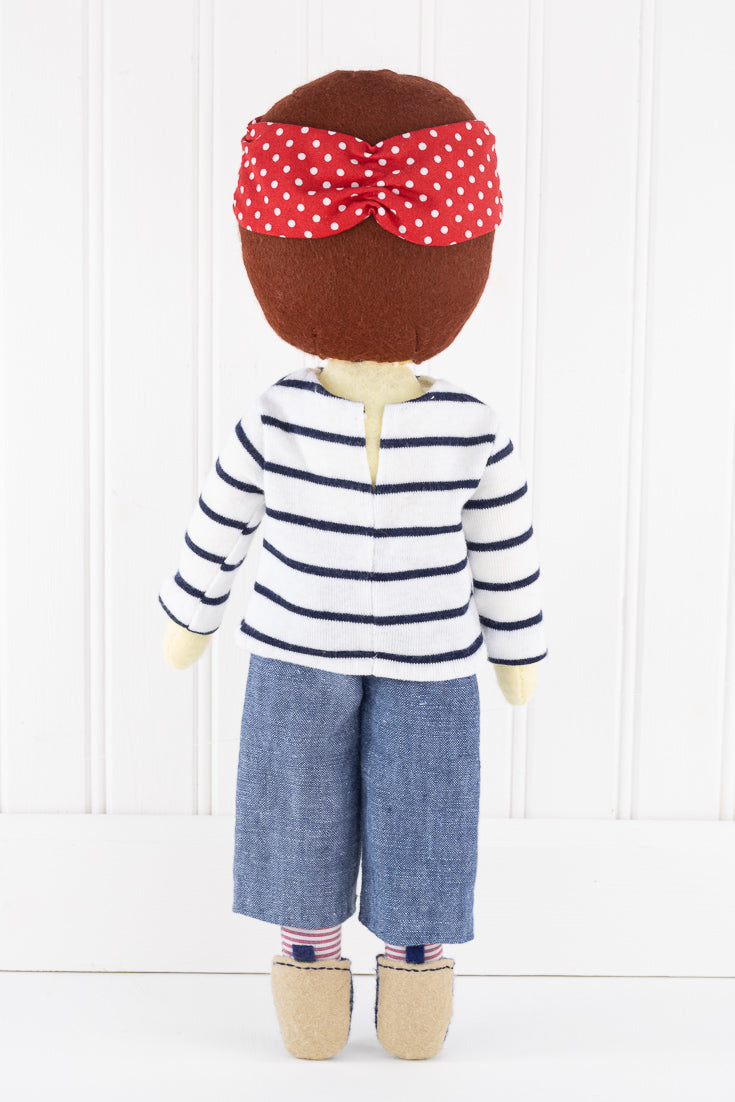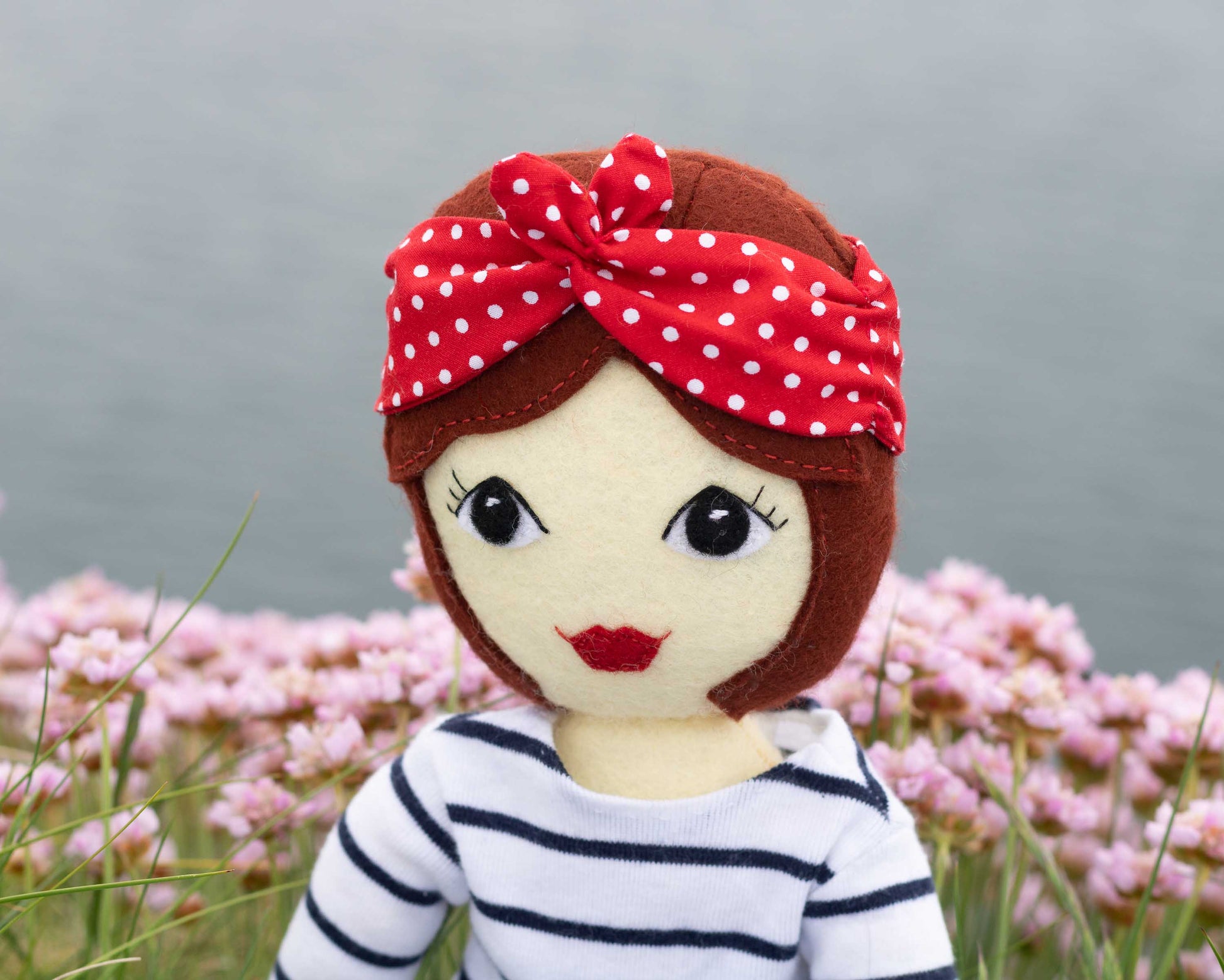 This bundle of 2 individual felt doll patterns includes 16 inch Tilly in her original outfit of stripy top, trousers, shoes and headscarf, and 11 inch Daisy in tights and a smock top.